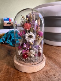 Moe maar voldaan, zit ik nu op de bank trots mijn droogbloem stolp creatie te bewonderen. Ik vond het super om dit te doen. En. Het geeft ook vertrouwen om dit vaker te doen! Achteraf besef ik mij dat ik dit ook zowaar solo heb gedaan. Ik durf eigenlijk weinig meer solo te ondernemen, vooral wanneer er prikkels om de hoek kijken… Dus ik ben dubbel verbaasd dat ik hier niet over nadacht EN dat het is gelukt! Dat geeft een burger moed!